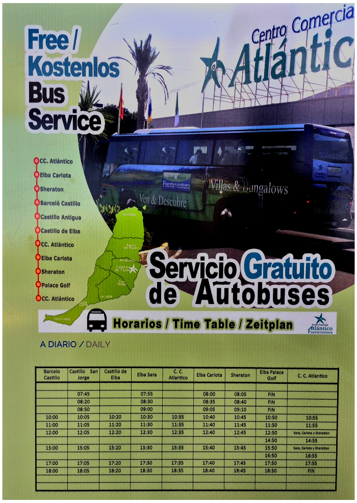 Er rijden gratis bussen tussen El Castillo en Las Salinas. De bus stopt bij diverse hotels en bij winkelcentrum Atlantico, vlakbij het strand van La Guirre. Download de folder voor de halteplaatsen en tijden.